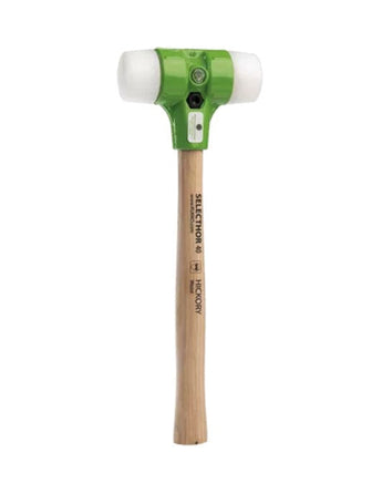 Non-rebounding hammer with replaceable impact elements with hickory handle. Hammer head is filled with micro metal beads to increase impact force while reducing bounce back and deadening impact. Made in Germany.