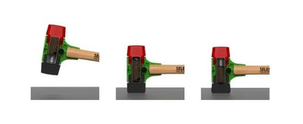 Non-rebounding hammer with replaceable impact elements with hickory handle. Hammer head is filled with micro metal beads to increase impact force while reducing bounce back and deadening impact. Made in Germany.