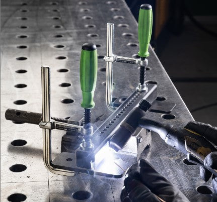 The all-steel VIRIDIS screw clamps with 2K comfort grip of the 469P series are used to press together and hold several workpieces in crafts, industry and workshops. With the built-in spring, the screw clamps absorb the vibrations of the workpiece. The 469P series is equipped with a 2-component handle that enables safe and stable workpieces